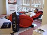 massiert wird, werden über Kopfhörer und Brille angenehme Musik und Lichteffekte abgespielt, die das Gehin in einen entspannten Zustand führen. |